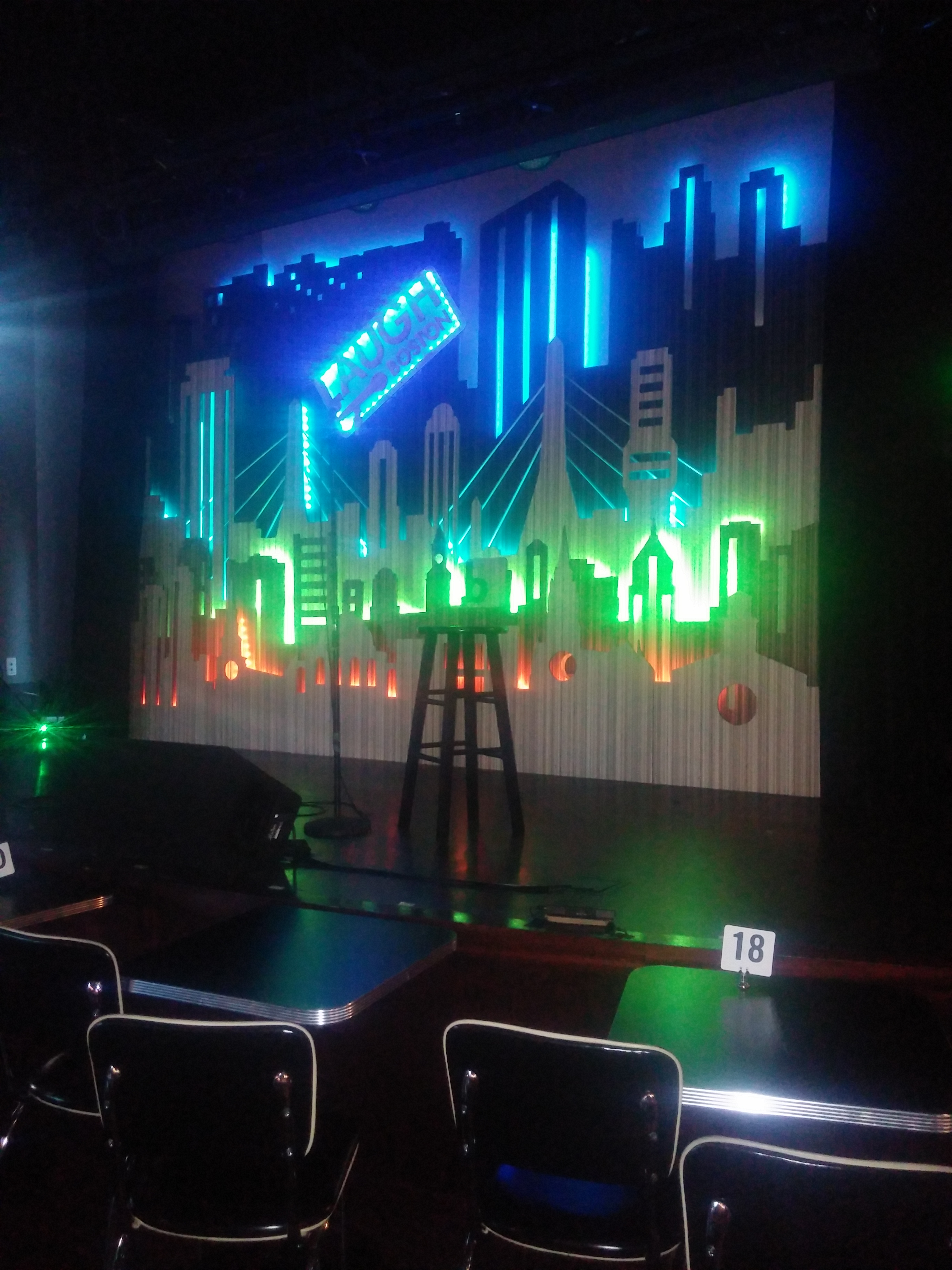 Cut out silhouettes of Boston City Skyline fill the stage at Laugh Boston. The silhouettes are representations of the actual Boston skyline. This set design creates interest for waiting customers before the comedian takes the stage. The LED back lighting is digital and can be controlled remotely for different lighting effects.