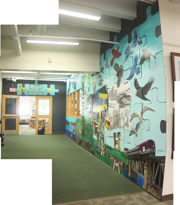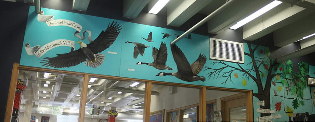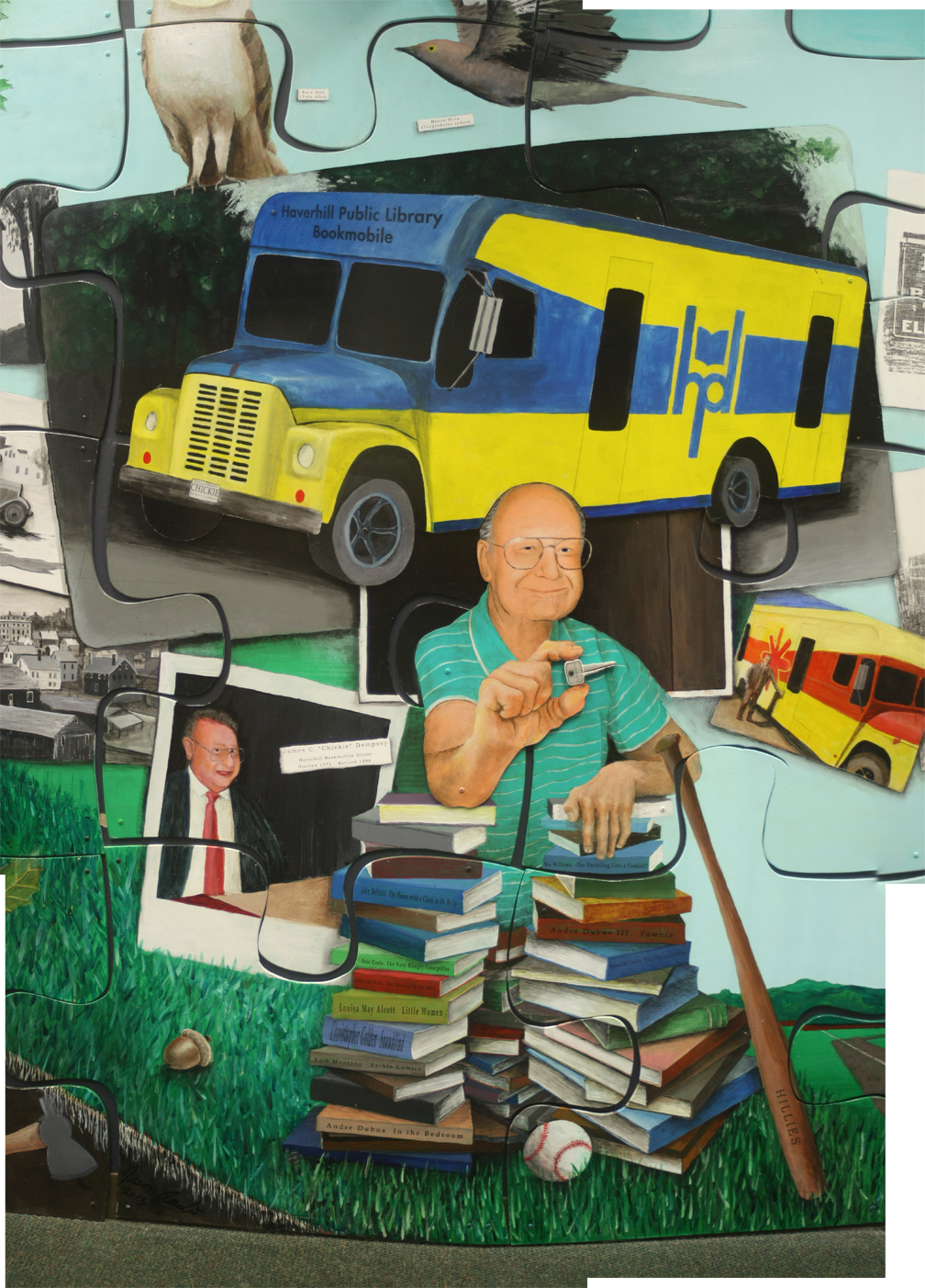 This Forty foot long puzzle piece mural assembles the history of Haverhill and some of its natural features. The core goal of this mural is to commemorate the long time Bookmobile driver Mr. Dempsey. As a part of the children’s library the mural also needed to be relevant to the children that visit the library with their parents.